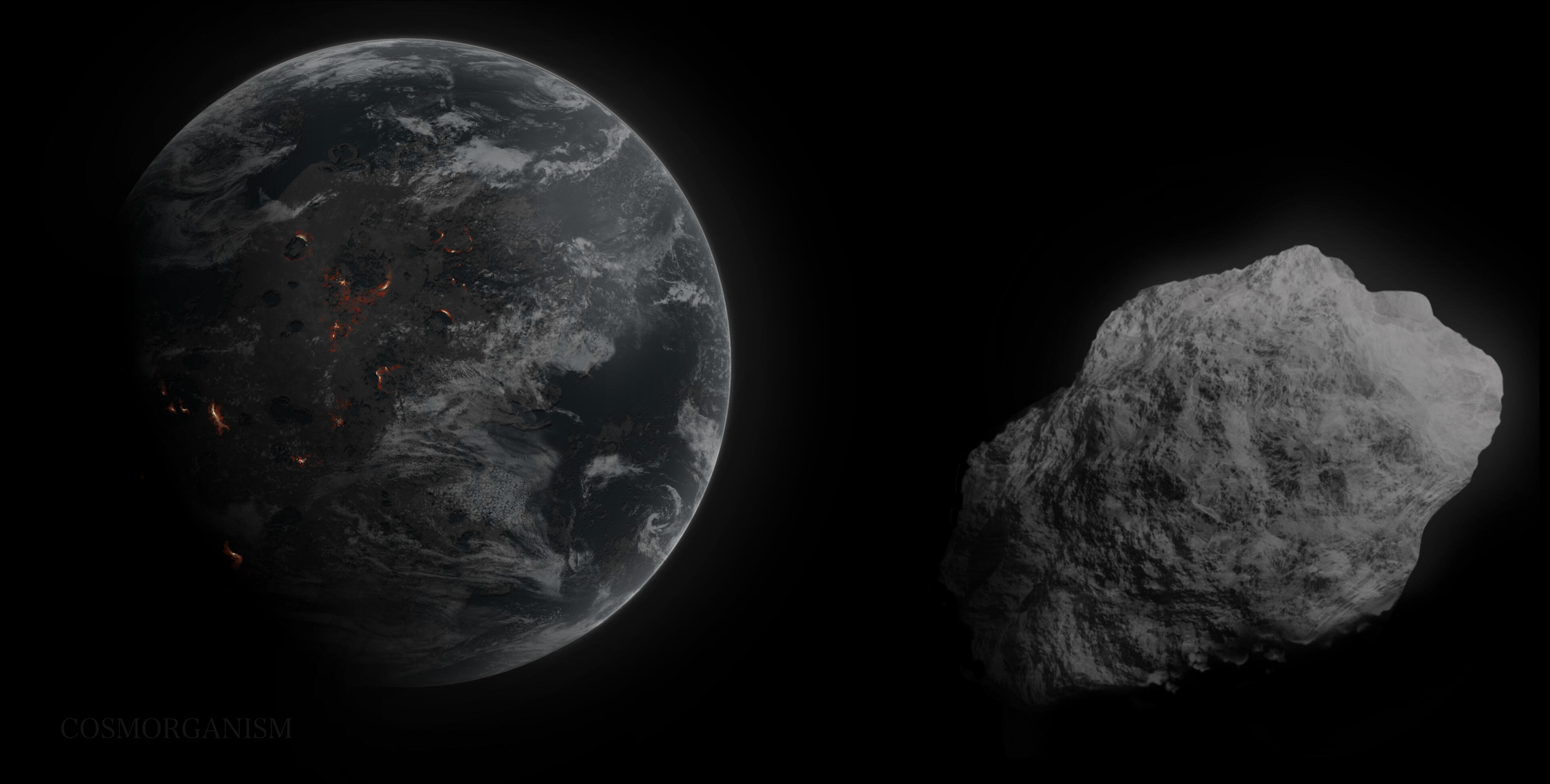 This artistic rendition takes you back billions of years into our planetary past when the Earth was facing turbulent seismic activity and mass extraterrestrial bombardment.One particular asteroid is seen hurling towards the nascent planet with great rigor, threatening to desecrate some of the newly formed landmasses. However, a spark of potential has hitched a ride on board—because not only is this asteroid water-rich, it also contains all five nucelobases necessary for DNA and RNA, reflecting recent findings on asteroids Bennu and Ryugu. Once it strikes the Earth, the impact crater will become a basin for a warm little pond, creating a cradle for these newly delivered biomolecules to amass in complexity.